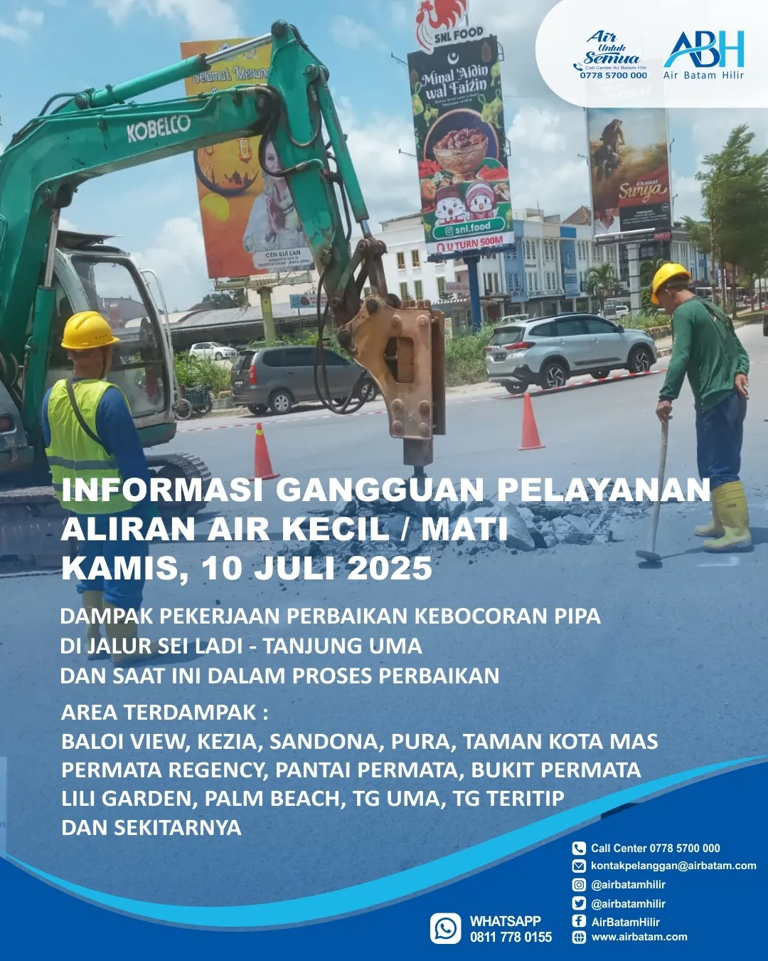 Batam, Stb.com – Pelanggan Air Batam Hilir, PT Air Batam Hilir (ABHi) menginformasikan, dampak pekerjaan perbaikan kebocoran pipa di Jalur Sei Ladi – Tanjung Uma dan saat ini dalam proses perbaikan.