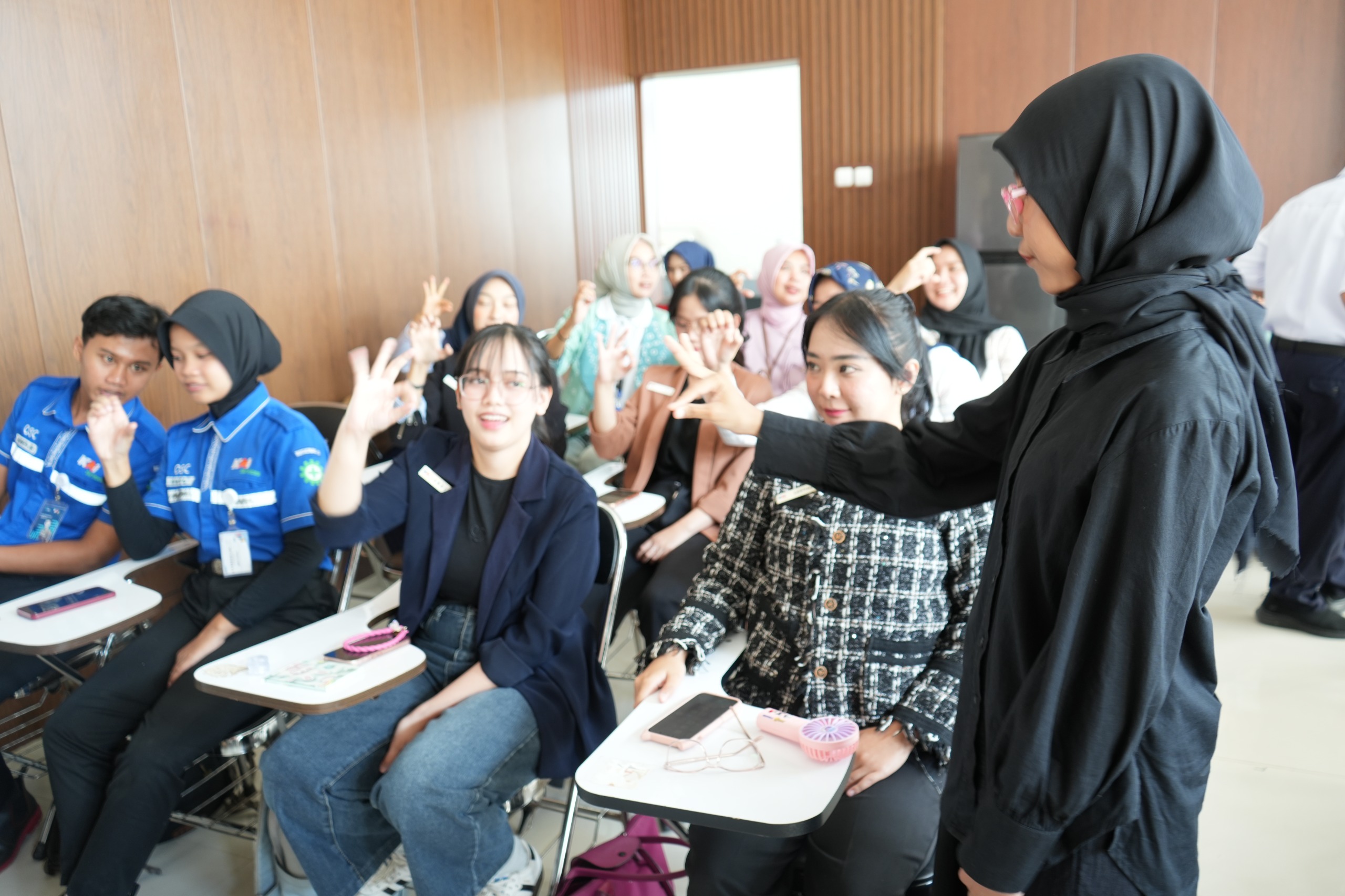 Selain itu, peserta juga diperkenalkan dengan Bahasa Isyarat Indonesia melalui Sistem Isyarat Bahasa Indonesia (SIBI). Pada sesi praktik, para petugas mempelajari berbagai bentuk komunikasi dasar menggunakan bahasa isyarat, mulai dari huruf alfabet A hingga Z, angka, hingga percakapan sederhana seperti salam dan penyebutan hari.