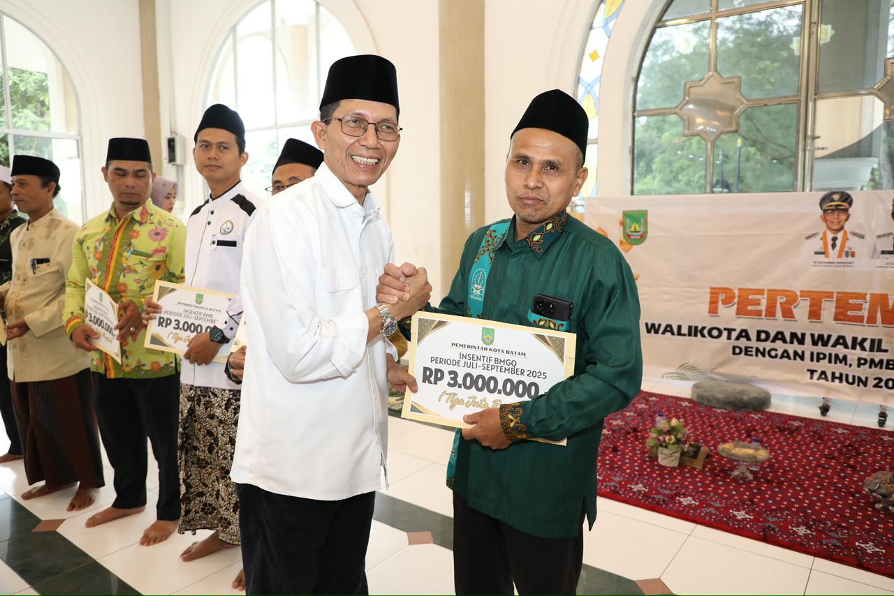 Batam, STB – Wali Kota Batam, Amsakar Achmad, menyerahkan secara simbolis insentif bagi tokoh agama yang tergabung dalam Ikatan Persaudaraan Imam Masjid (IPIM), Persatuan Mubaligh Batam (PMB), dan Badan Musyawarah Guru Al-Qur’an (BMGQ) periode III tahun 2025.